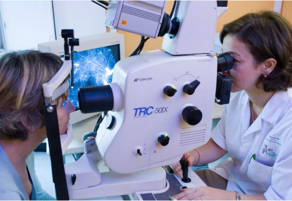 Female practitioner examining a patient’s eye with FFA.