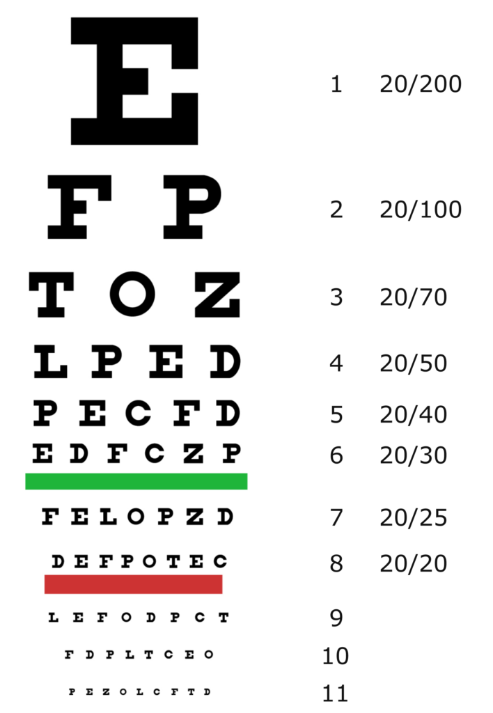 Snellen Chart to test visual acuity showing letters in different font sizes that get smaller with every line.