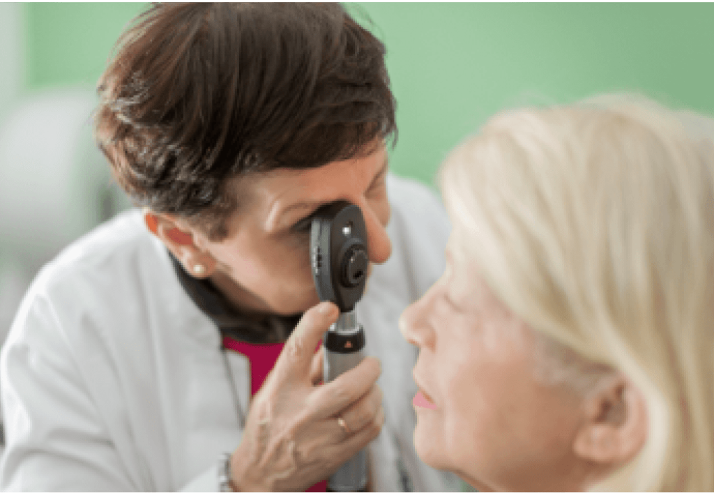 Practitioner examining a patient’s eye using a handheld ophthalmoscope.